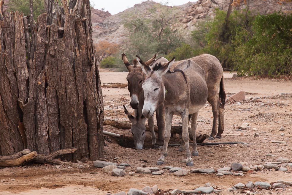Mit den schönen Landschaftsaufnahmen am nächsten Morgen wird es allerdings nichts. Es ist extrem stark bewölkt und einige Minuten lang tröpfelt es sogar leicht. Kaum sitzen wir wieder am Tisch, naht die nächste Unterbrechung – diesmal von drei grauen Vierbeinern. Statt der erhofften Wüstenelefanten wandern drei Esel über den Campingplatz. Die haben schon einige Male unsere Nachtruhe gestört und versperren nun mehrere Minuten lang den Eingang zu Dusche und Klo. Das nimmt ihnen aber keiner übel, weil sie lange genug stehen bleiben, bis alle Tierfreunde am Campingplatz genug Fotos geschossen haben. Dann geben die Grautiere den Eingang wieder frei und begeben sich auf die Rückseite der Dusche, um zu trinken.