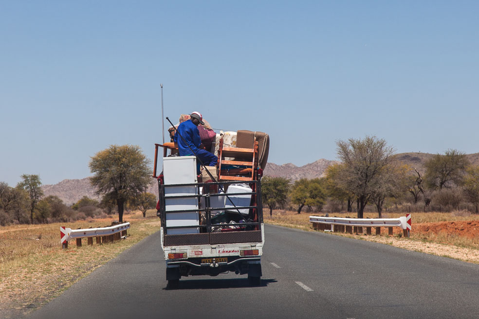 Das Verkehrsaufkommen ist außerhalb von Städten auch auf Hauptstraßen sehr gering. Häufig sind hier mehr Fußgänger als Autos unterwegs. Fußgänger in den Städten verlassen sich meistens blind darauf, dass die Autofahrer bremsen, wenn sie über die Straße gehen. Bei Fahrten über Land macht das keiner. Dafür laufen hier häufig Tiere über die Straße. Wir werden auf Straßen außerhalb von Nationalparks von Ziegen, Kühen, Hunden, Warzenschweinen, Springbocks, Oryxen und Elefanten ausgebremst.