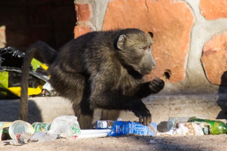 Am nächsten Morgen hören wir rundherum lautes Geklapper. Die Paviane durchsuchen systematisch die Mülltonnen. Bei uns ist außer leeren Getränkeflaschen und einer Bananenschale nichts zu holen. Manfred geht mit der Kamera auf Affenjagd.