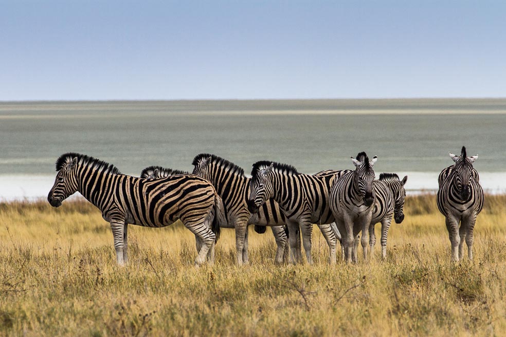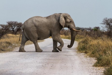 Giraffen, Zebras, Gnus und einen Oryx können wir aus der Nähe beobachten, eine Giraffe und einige Springbocks nicht nur neben der Piste. Dann sehen wir unseren ersten Elefanten in der Steppe – mit einer Herde Gnus und der Etosha-Pfanne im Hintergrund. Kurz darauf überqueren drei Elefanten vor uns die Straße. Der Adrenalinspiegel ist schon wieder ziemlich hoch.