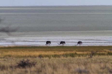 Auf dem Weg zum Namutoni Camp fahren wir noch zum Wasserloch Okerfontein. Die kurvenreiche Piste ist in gutem Zustand. Wir genießen die relativ üppige Vegetation und die Ausblicke auf die Etosha-Pfanne. Der Strauß in der Etosha-Pfanne und die drei Artgenossen, die an der Pfanne entlang laufen, sind zwar weit weg, aber vor diesem Hintergrund trotzdem etwas Besonderes.